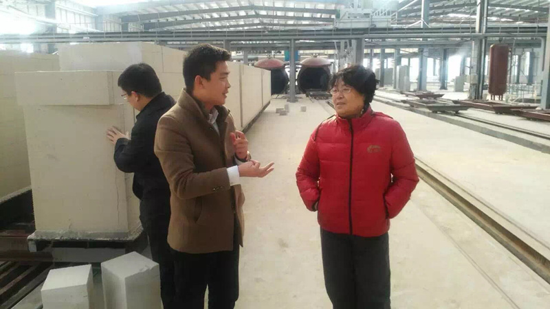 隨后,滕會長一行來到東岳加氣混凝土生產(chǎn)線車間,對生產(chǎn)線的垃圾循環(huán)利用及節(jié)能環(huán)保等設(shè)計創(chuàng)新給予了充分肯定。希望能進一步組織好調(diào)試生產(chǎn),針對煙氣凈化處理設(shè)備做好效果檢測,真正把環(huán)保墻材生產(chǎn)建設(shè)落到實處,在行業(yè)起到表率作用。滕會長參觀了東岳加氣混凝土砌塊生產(chǎn)線(板材生產(chǎn)線)、灰砂磚生產(chǎn)線,對示范生產(chǎn)線的運行與循環(huán)處理情況給予肯定,對集成房屋的建設(shè)極力推廣。